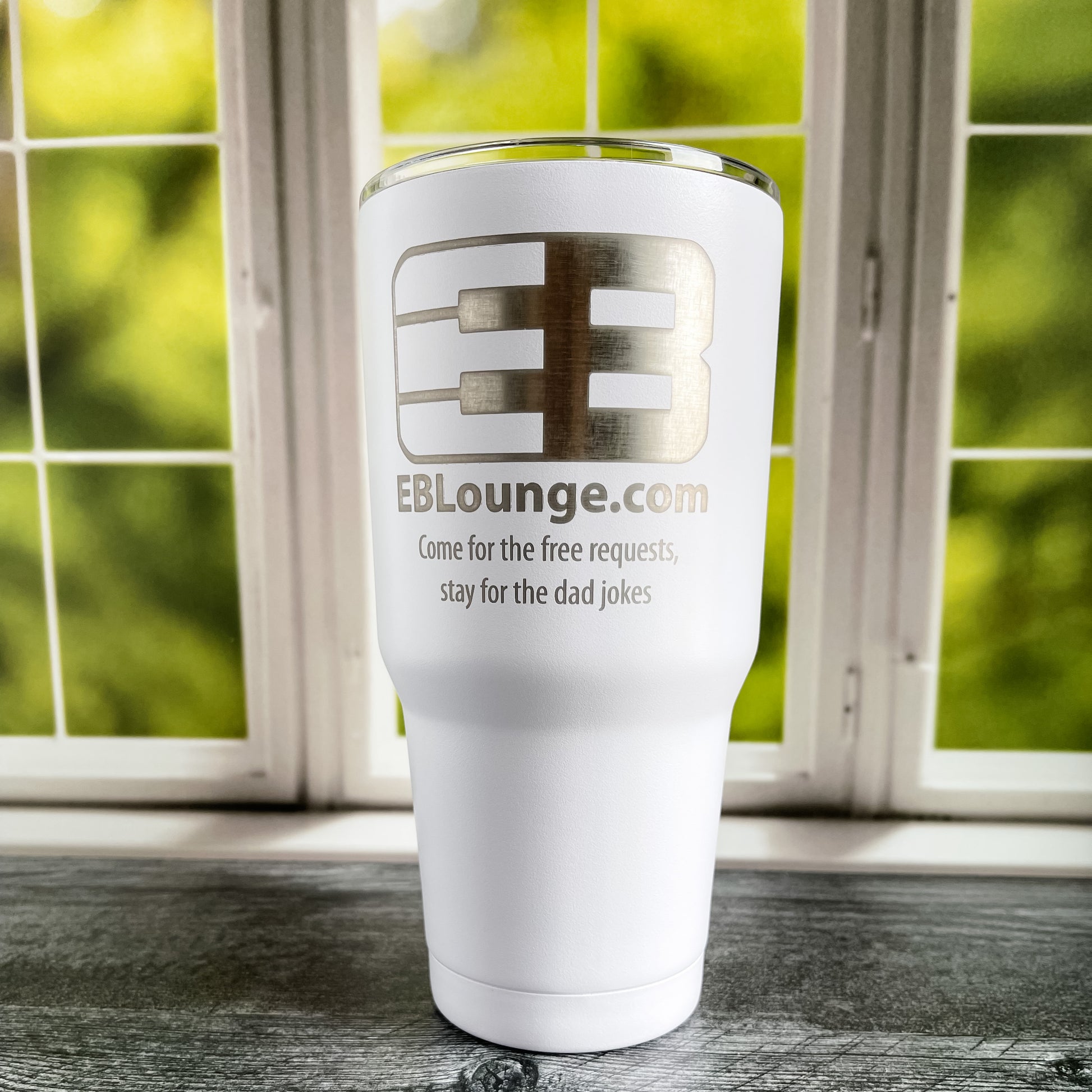 These official EBLounge, 30oz tumblers are perfect for listening to everyone's favorite piano lounge. The logo is laser engraved into the powder coating to provide a long lasting and durable finish. Also, these tumblers include FREE SHIPPING inside the US!
