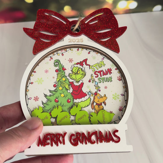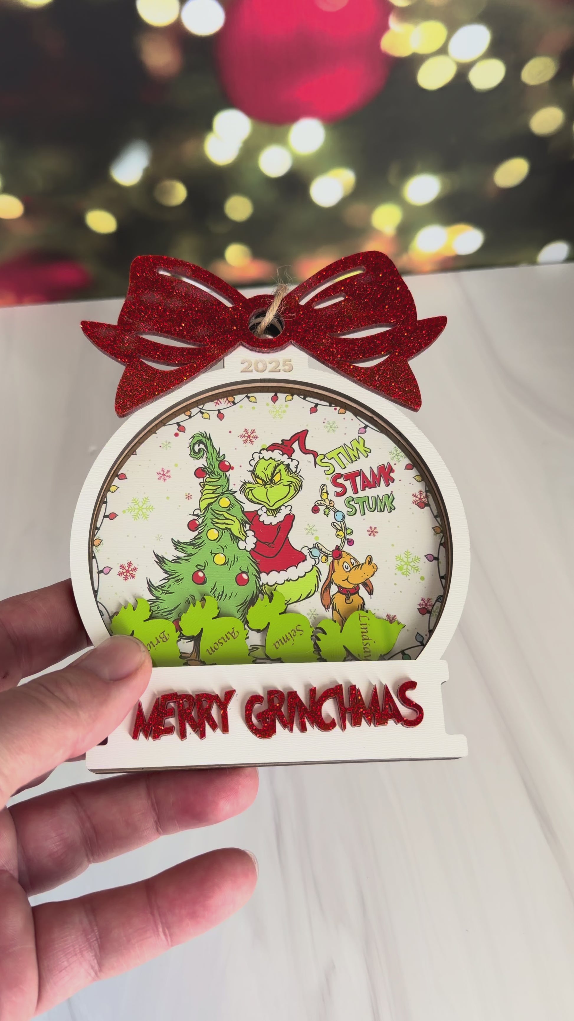 Crafted from high-quality wood, it features a sparkling red glitter bow topped with the year engraving. The central shaker globe is filled with loose mini Grinch cutouts—each laser-engraved with your chosen names (up to 15, for family, friends, or pets)—surrounding the iconic Grinch in his Santa suit, with Max stealing a tree amid "Stink Stank Stunk" bubbles. Shake it to watch the mini Grinches swirl for added fun!