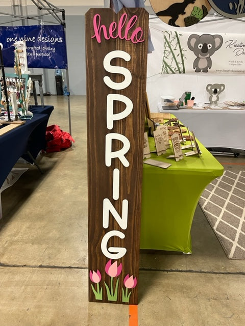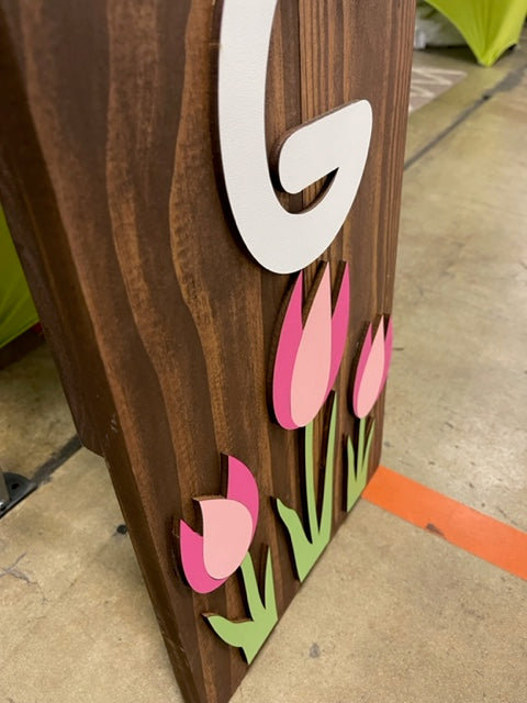 This super cute porch leaner is perfect for the spring season. It stands 5 foot tall and is hand stained with a dark walnut stain and all pieces and letters are laser cut and hand painted and assembled.